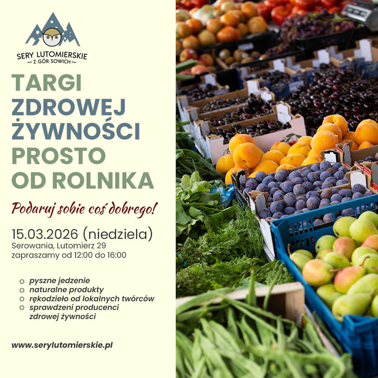 Już w tę niedzielę, 15 marca, zapraszamy serdecznie do Lutomierza na wyjątkowe Targi Zdrowej Żywności – Prosto od Rolnika! Wydarzenie od lat przyciąga zarówno stałych bywalców, jak i nowych miłośników jakościowych produktów z Dolnego Śląska.