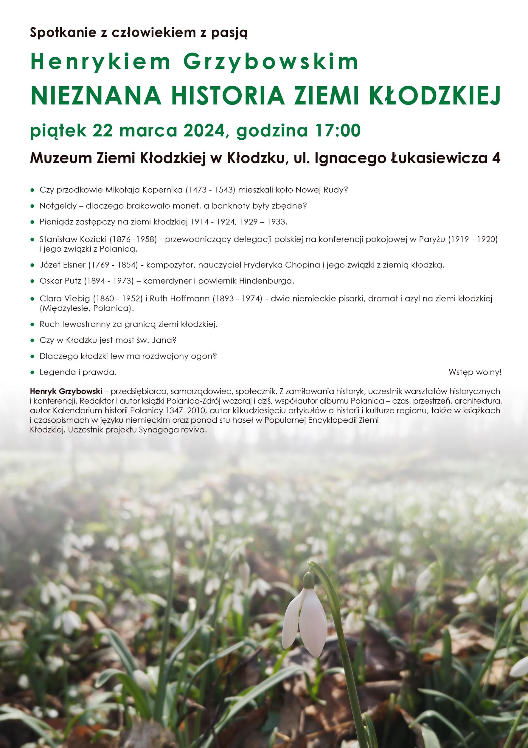 Henryk Grzybowski – przedsiębiorca, samorządowiec, społecznik. Z zamiłowania historyk, uczestnik warsztatów historycznych i konferencji. Redaktor i autor książki Polanica-Zdrój wczoraj i dziś, współautor albumu Polanica – czas, przestrzeń, architektura, autor Kalendarium historii Polanicy 1347–2010, autor kilkudziesięciu artykułów o historii i kulturze regionu, także w książkach i czasopismach w języku niemieckim oraz ponad stu haseł w Popularnej Encyklopedii Ziemi Kłodzkiej. Uczestnik projektu Synagoga reviva.