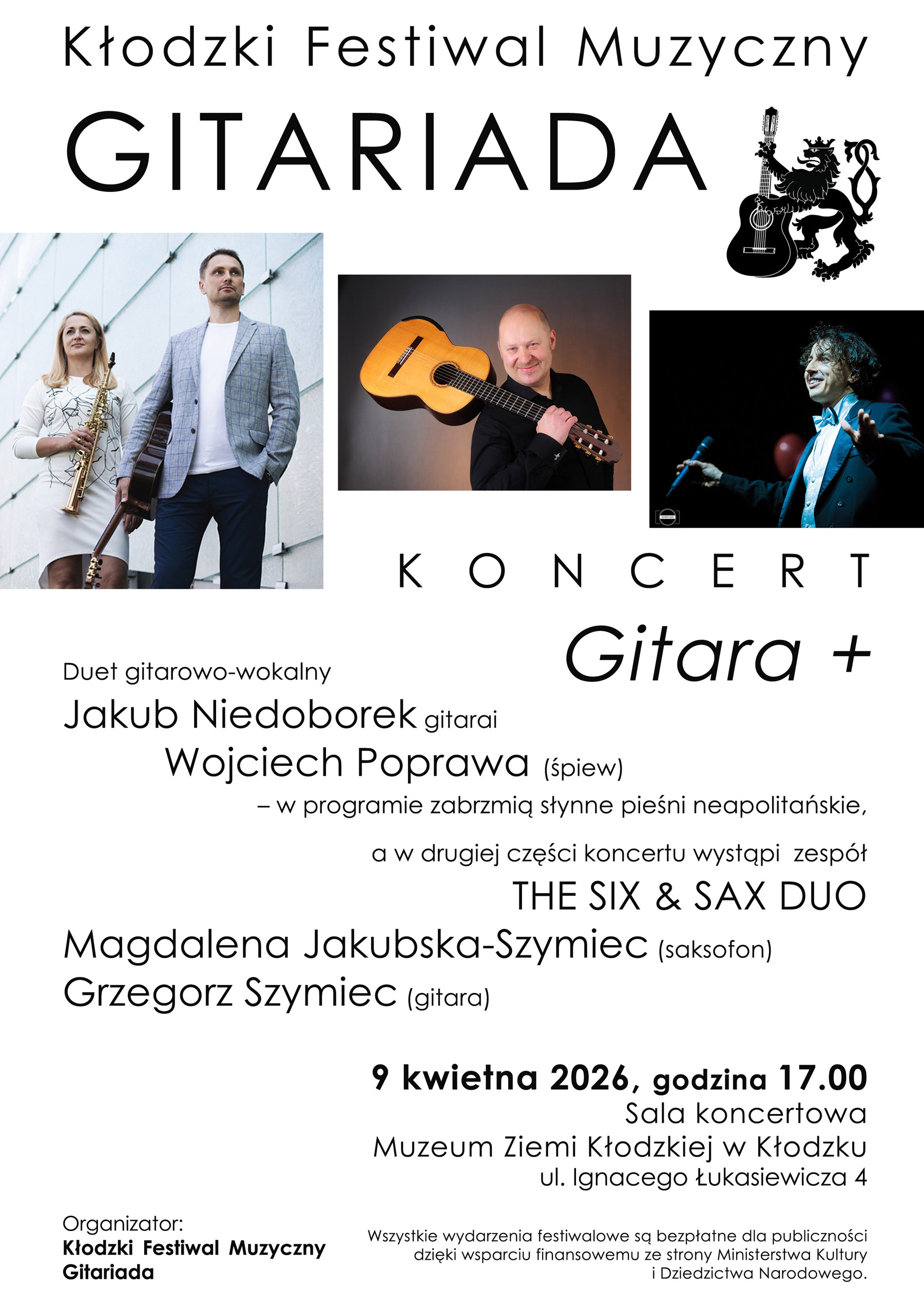 V první polovině koncertu vystoupí kytarovo-vokální duo Jakub Niedoborek (kytara) a Wojciech Poprawa (zpěv), kteří zahrají slavné neapolské písně. V druhé polovině koncertu vystoupí THE SIX & SAX DUO - Magdalena Jakubska-Szymiec (saxofon) a Grzegorz Szymiec (kytara) - kteří v Kladsku vystoupí poprvé.