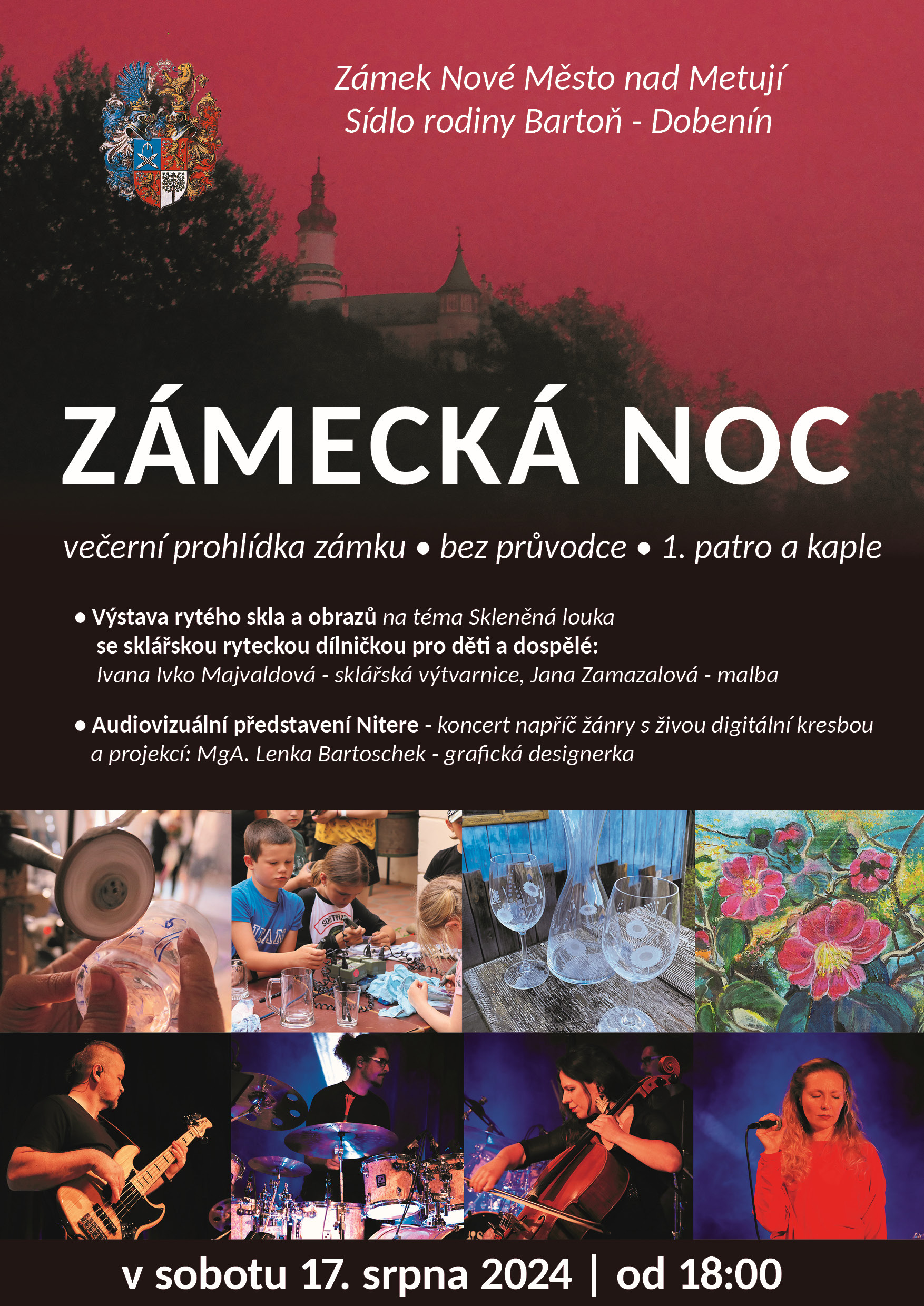 Během večera si budete moci samostatně projít interiéry prvního patra zámku a zámeckou kapli. Prohlídky budou obohaceny o hudební, buskingové vystoupení. Od 20 hodin se můžete těšit na audiovizuální vystoupení skupiny Nitere na nádvoří zámku.
